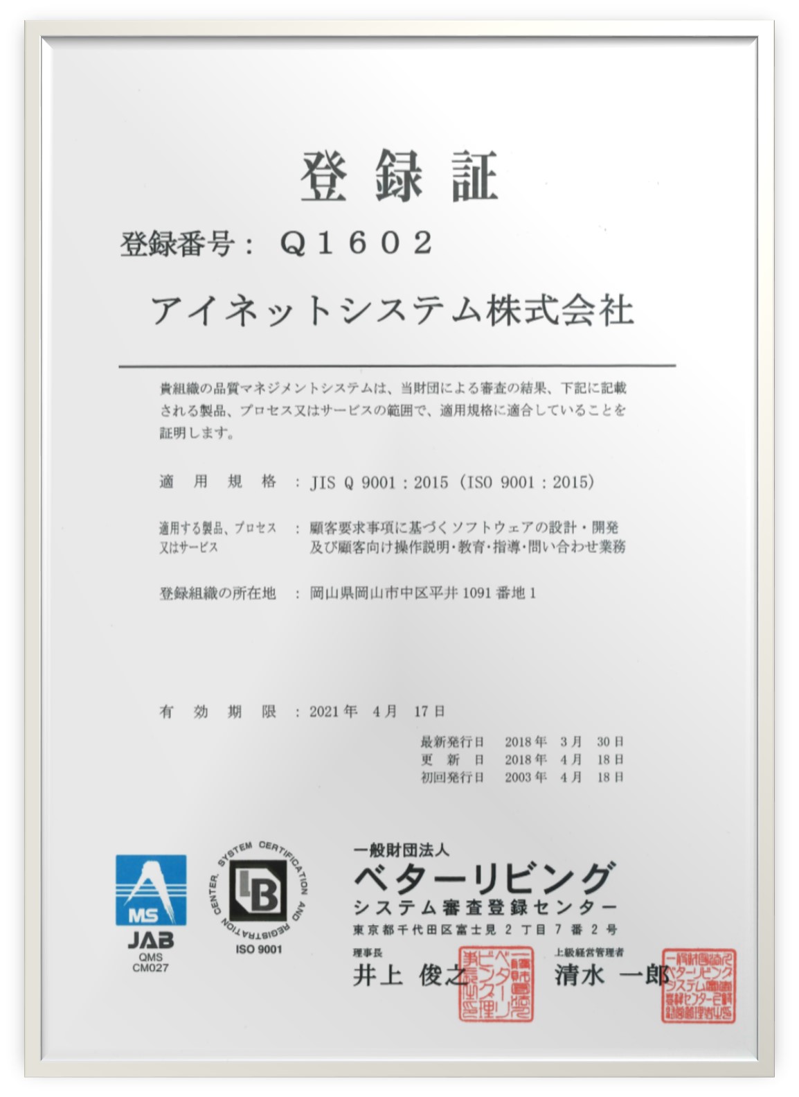 平成15年4月18日 ソフトウエアの設計・開発に関するISO9001品質システムの認証を取得いたしました。